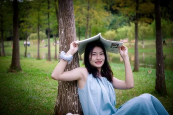 初夏东莞的潮润绿意里,取两个切面锚定松弛:东莞植物园的自然褶皱,愈欣书店的暖光褶皱。 南城“城市绿肺”的僻静草坪,香樟织就的荫凉里,长椅落着碎光斑。浅蓝裙衔接草木青空,她垂眼翻岭南植物随笔时,页脚夹着刚拾的樟叶——风掀书页时理发的动作,是薄汗沾碎发的本能;水杉下以书遮顶,是云隙强光撞出的笑眼,这市民遛弯的日常地,因避开花境成了半日私域。 转场愈欣书店,像翻完自然散文接人文画册。这家东莞本土独立书店匿于商圈僻静处,暖光裹着咖啡墨香,无网红装饰的踏实里,她捧植物插画集的侧影,指尖蹭过铜版纸的认真;窗边背影是盯楼下单车的片刻失神,肩线松垮成城市的放空间隙。 这些镜头剥去摆拍外壳:长椅的随性、遮光的书、书店的停顿,都是东莞的日常松弛——不必远寻,绿肺是楼下舒展,书店是街角停泊,镜头不过缝起这半日温柔序章。