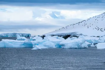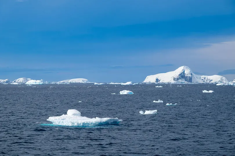 蔚蓝的极地海面上,冰山如静默的巨兽耸立, 清风掠过雪白的棱角,光从缝隙间折射成幽蓝的光。 几只企鹅沿着冰缘缓缓行走, 黑白的身影在广袤的白色世界里格外醒目。 它们偶尔停下脚步,望向远处漂浮的冰山, 仿佛在与这片古老的南极分享一个只有极地才懂得的秘密