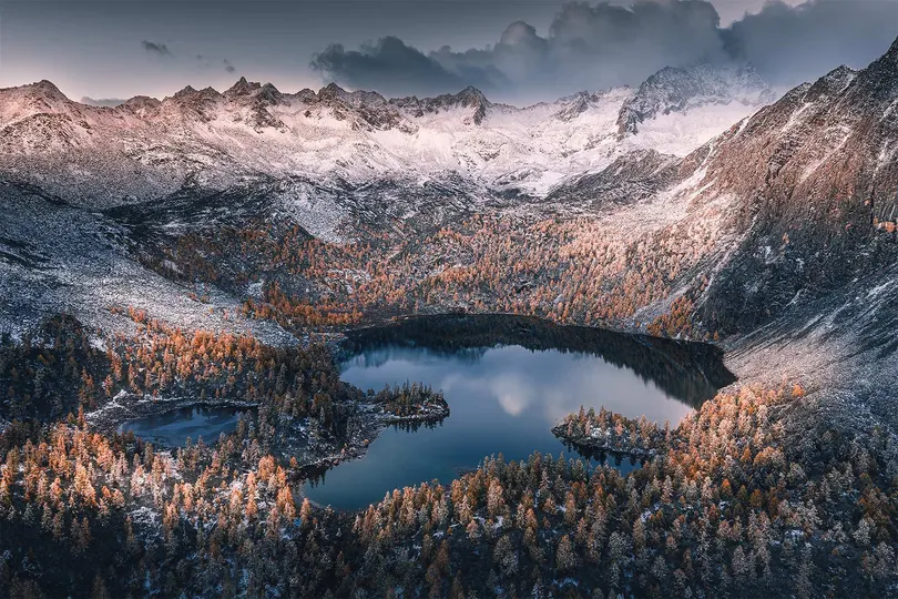 冷艳的雪色裹着山尖,暖调的金黄浸满湖畔,湖水把天地揉成一帧温柔的镜像。风掠过的时候,连时光都慢成了画里的样子。