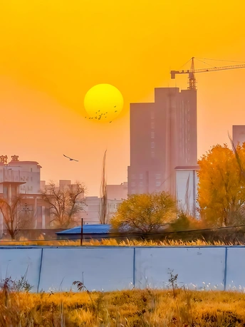 秋意黄昏中的城市一隅:落日熔金,飞鸟归林!