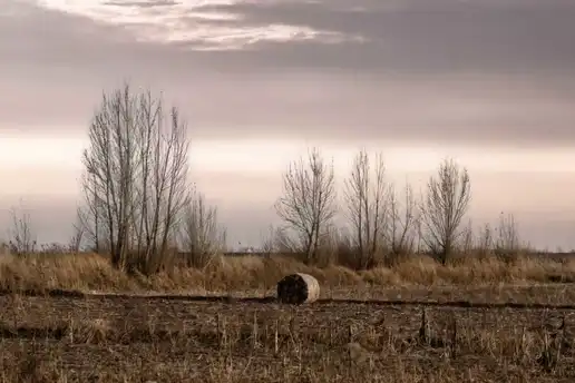这幅冬日旷野图以极简构图勾勒出萧瑟而诗意的生命寓言。构图采用"三分法"分层:近景田垄的水平线条切割土地,中景枯树以参差剪影打破地平线单调,远景云层的絮状纹理呼应地面枯草,形成"地-树-天"的垂直韵律。中央草垛如孤独的音符,在广袤田野中构成视觉锚点,而枯枝的放射状线条则为静态画面注入向上的张力,整体呈现"空而不虚"的东方美学意境。 色彩上以灰褐色调构建沉郁氛围。枯黄的草地从赭石过渡到深褐,枯枝的灰黑与云层的铅灰形成冷色调基底,唯有天际线处透出微弱的米白曙光,如希望的隐喻。这种近乎单色的色彩处理,将冬季的肃杀与苍茫浓缩于有限色域,却通过明度变化展现丰富层次——草垛的暖棕与云层的冷灰构成微妙对比,暗示着萧瑟中的生命余温。 情感表达上传递出孤独与坚韧的双重意涵。光秃秃的树枝指向阴沉天空,似在无声叩问;孤立的草垛则如时间的守望者,在空旷田野中坚守。观者既能感受到万物蛰伏的苍凉,也能从枯枝的倔强姿态中读出生命的韧性。这种"寂而不灭"的意境,暗合东方哲学中"否极泰来"的生命观,在压抑中酝酿着春回大地的希望。 主题层面探讨"自然时序与人类痕迹"的关系。收割后的田垄与捆绑的草垛,是人类活动的静默见证。