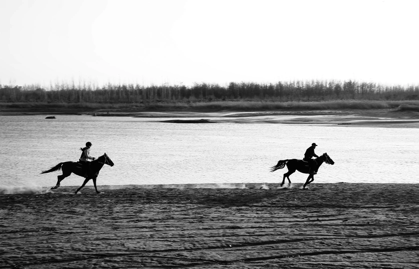 - 视觉冲击力:黑白影调+剪影效果,把人物、马匹的轮廓简化成利落的线条,配上动态的奔跑姿态,既干净又有张力,像在讲一个自由舒展的故事。 - 场景层次:前景的沙地、中景的水面、远景的树林,三层空间拉开了画面的纵深感,不会显得单调;奔跑扬起的尘土细节,还添了几分真实的动感。 - 情绪传递:空旷的环境+飞驰的身影,有种“天地间尽兴驰骋”的松弛感,黑白滤镜又让画面多了点复古和文艺的味道。
