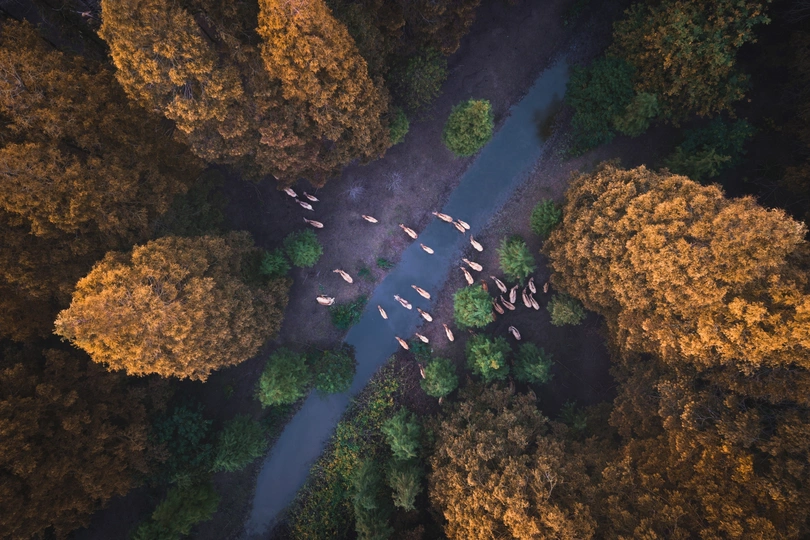 日落时分的水杉林中,一群麋鹿结束觅食,正穿过小河去往平日休憩的地方,我升起无人机正好看到了这一幕。秋日的水杉渐黄,麋鹿就像林间的一群精灵,正陆续通过河道 拍摄于盐城麋鹿自然保护区,中华麋鹿园景区是全球唯一以“湿地生态、麋鹿保护”为主题的国家5A级旅游景区,也是世界上面积最大、种群数量最多的野生麋鹿园 Shot on Dji Air3s