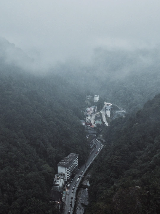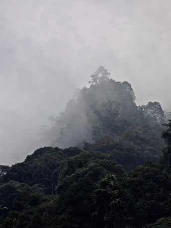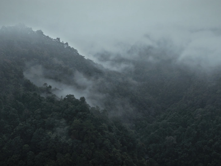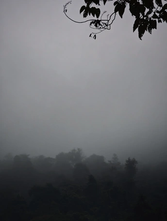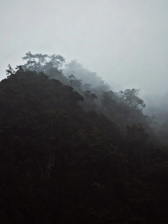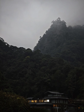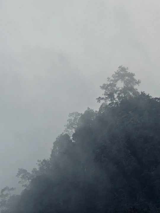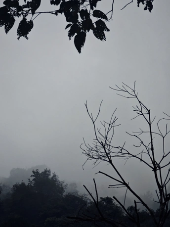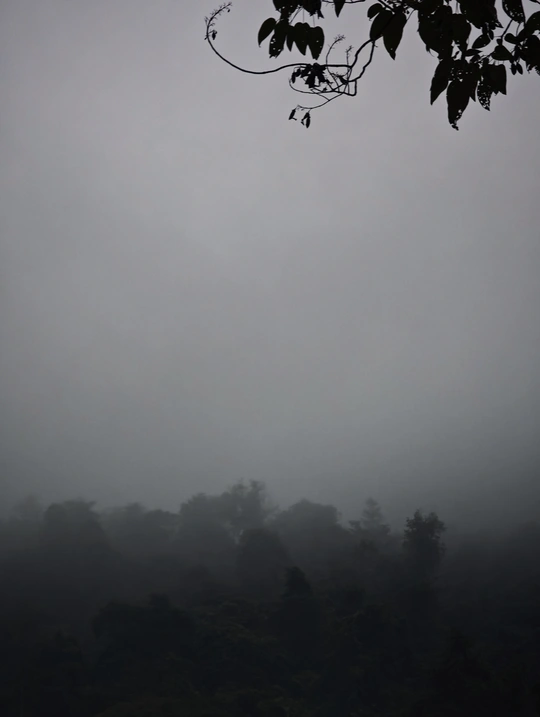 山被浓得化不开的雾裹成了半透明的墨色,连风都慢下来——建筑蜷在山坳里,像被云藏起的心事;枯枝在雾里支棱着,是没说出口的怅惘;连每片叶尖的湿意,都浸着“天地都静了”的孤清。像一场没醒透的梦,裹着凉津津的温柔,又藏着望不穿的沉郁。
