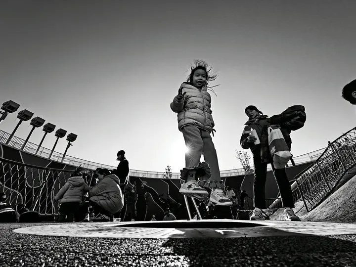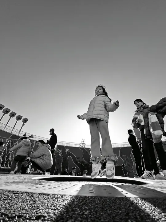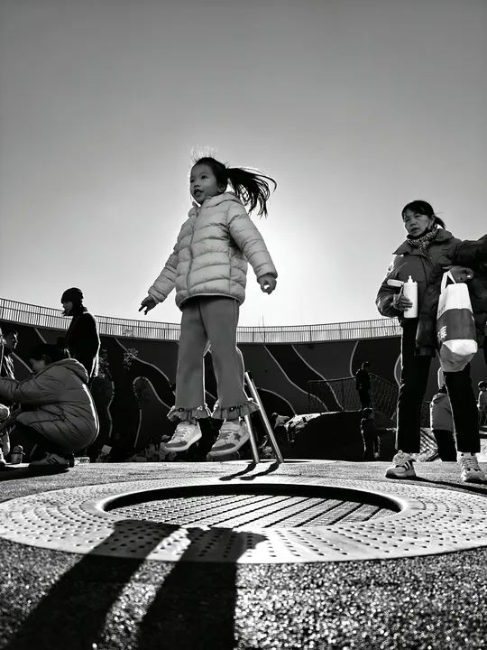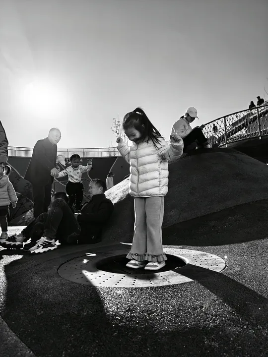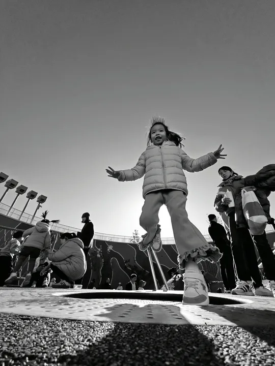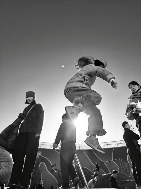 把镜头对准她跃起的瞬间,逆光把羽绒服的轮廓揉成毛茸茸的光晕,连同发丝里的风一起,被装进黑白的温柔里。原来孩子的快乐从不需要滤镜,光是跳起来这一件小事,就能让整个下午都发着亮。