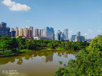 雨季后的南宁五象湖公园,湖水有些浑浊,树木绿意盎然,天空一片晴朗,天空的蓝色、建筑的玻璃反光蓝色、黄色的建筑,各种色彩交织在一起,这便是这个雨季的颜色,也是夏天。(夏天拍的现在发)