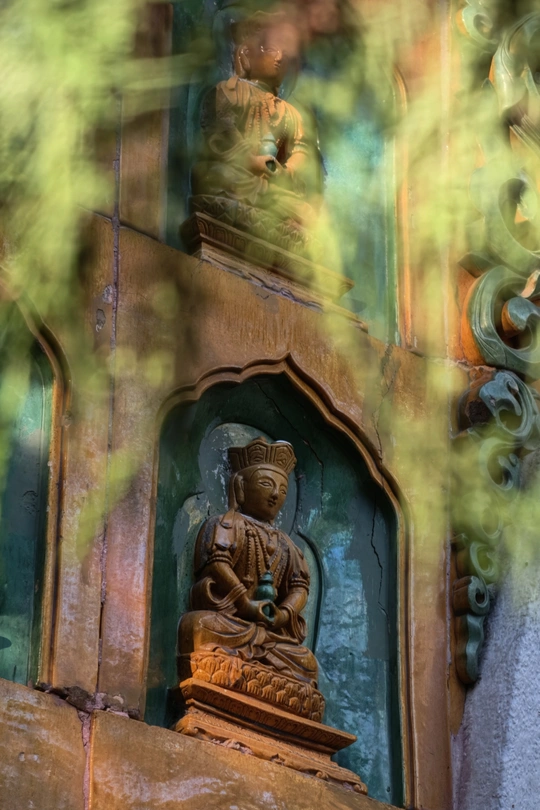 万寿山的枝桠垂下来,把智慧海的琉璃佛龛裹进碎光里。千尊小佛藏在树影褶皱里,釉色浸着秋阳,连残痕都染了点禅意的软。