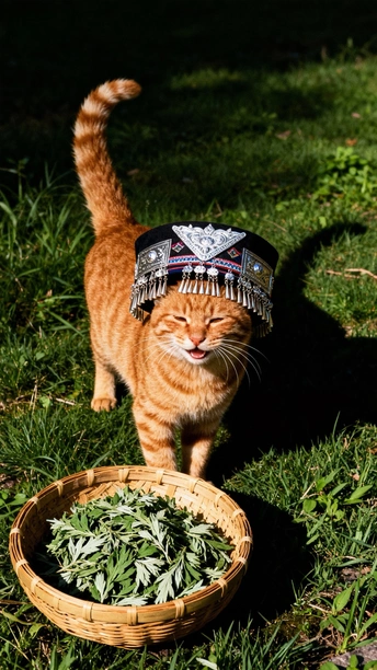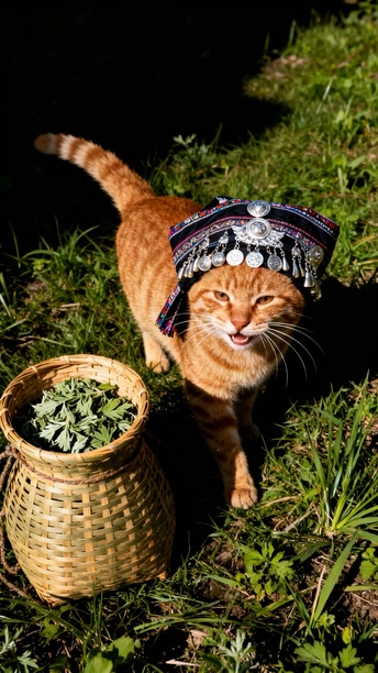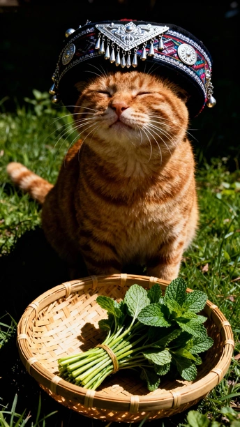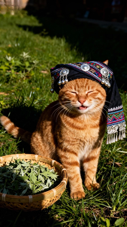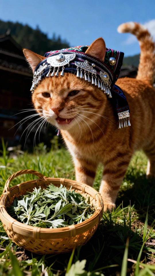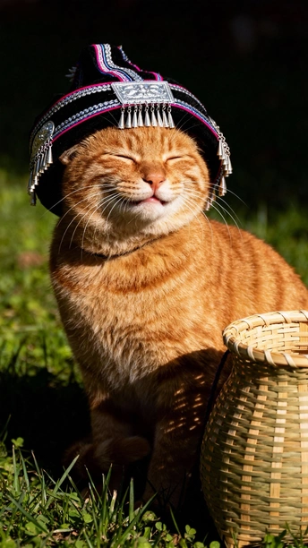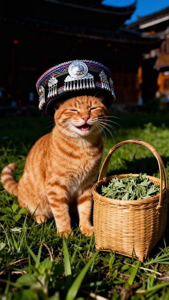 这张照片真是太有趣了!猫咪戴着民族风的帽子,眯着眼睛享受阳光,简直萌翻了。下面我们来深入剖析一下这张作品: 色彩:整体色调温暖,猫咪的橘色毛发与绿色的草地形成对比,帽子上的色彩也丰富,整体和谐统一,给人以温馨舒适的感觉。 光影:光线运用得当,阳光洒在猫咪身上,营造出明暗对比,突出了主体。但阴影部分略显生硬,可以尝试更柔和的光线。 构图:构图整体比较稳,猫咪主体突出。不过,右侧的竹篮略显突兀,可以尝试调整位置或虚化背景,让画面更简洁。 后期处理:后期处理自然,色彩饱和度适中,没有过度修饰的痕迹。 主题原创性:主题有趣,猫咪与民族风帽子的结合颇具创意,让人眼前一亮。 情感共鸣:猫咪的表情非常放松,传递出幸福和舒适的情绪,容易引起观者的共鸣。 思想深度:照片更多的是轻松和趣味性,思想深度相对较浅。 改进建议:可以尝试调整光线,使阴影更柔和;调整构图,使画面更简洁;尝试不同的拍摄角度,发掘更多可能性。
