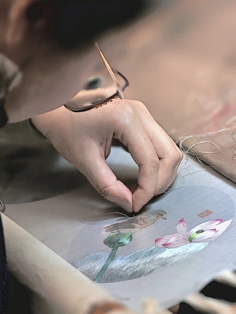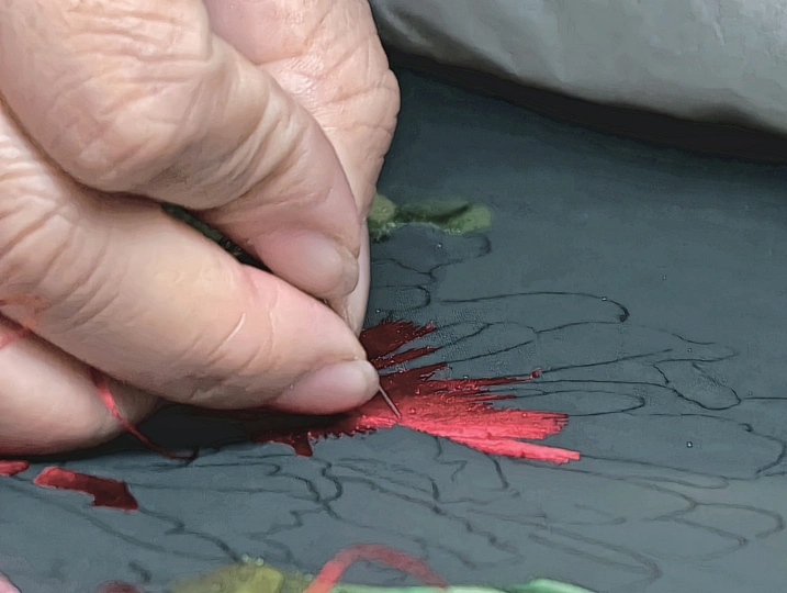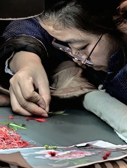 轻捻绣线缠指尖,掌纹裹针尖落布,细密线脚织开非遗的温软肌理。