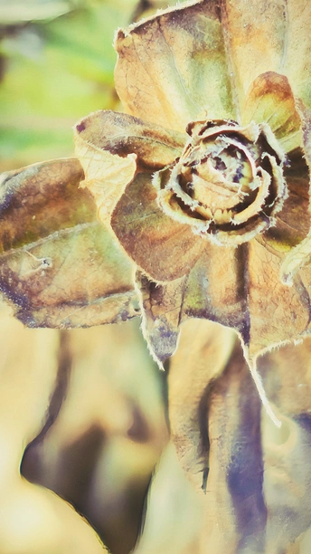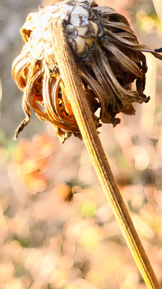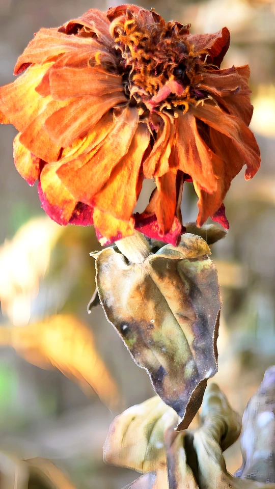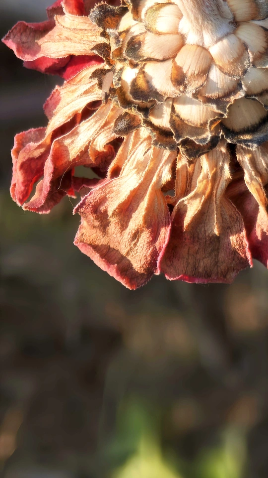 残花落瓣的百日菊已繁华退尽,初冬时节完美的留下了残红点点,竟比盛开时更有一番风致、静谧与美感。诠释了残花之美也是一种别样的美,留下了比盛开更深的印记!