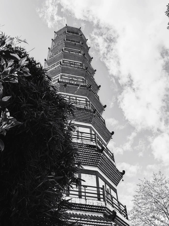 “飞檐刺破苍穹,风铃摇响千年。 三元塔的每一块砖石,都镌刻着‘连中三元’的古老祈愿; 黑白光影里,榕荫与苔藓交织成岁月的纹路。 当镜头聚焦塔尖的凌霄之志, 我们看见—— 时光在此驻足,历史在此回响。”