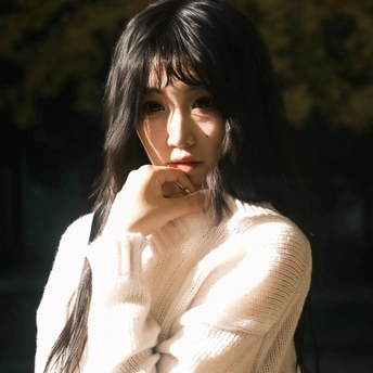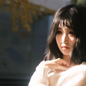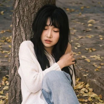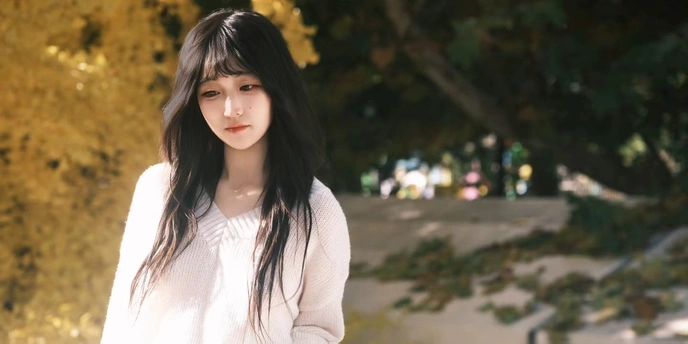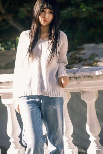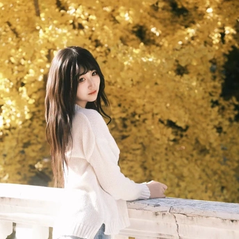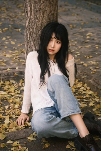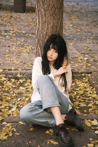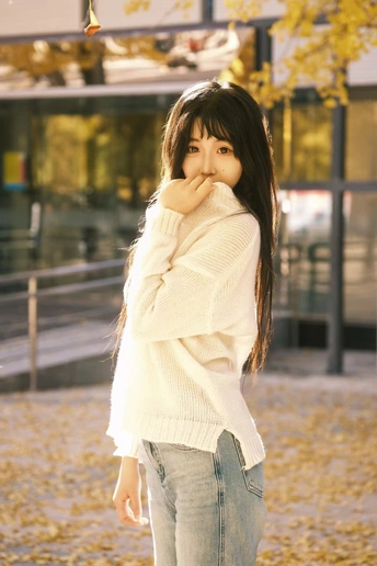她总以素雅之姿融入季节的诗行——乌黑长发垂落肩头,齐刘海下眸光温润如溪,宽松白毛衣裹着清瘦肩线,浅蓝牛仔裤沾染几片金箔般的落叶,仿佛刚从林间信步而来。