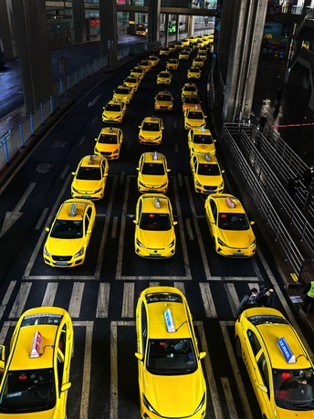 重庆江北国际机场的落客匝道上,黄色“法拉利”正列阵待客——明晃晃的车身顺着车道铺成金流,顶灯在航站楼的玻璃反光里漾着微光。广播里航班抵达的提示音刚落,行李车的滚轮声裹着旅人轻快的脚步近了,这些“山城仪仗”的引擎便轻颤起来,像是在应和空港里的人声。刚取下托运箱的乘客往队列里一靠,车门“咔哒”弹开的瞬间,连廊外的廊桥影、停机坪的机翼光,都跟着卷进了这程即将扎进山城的风里。