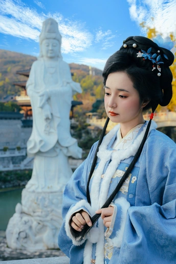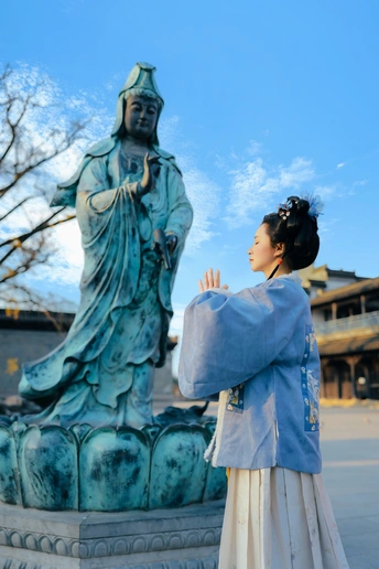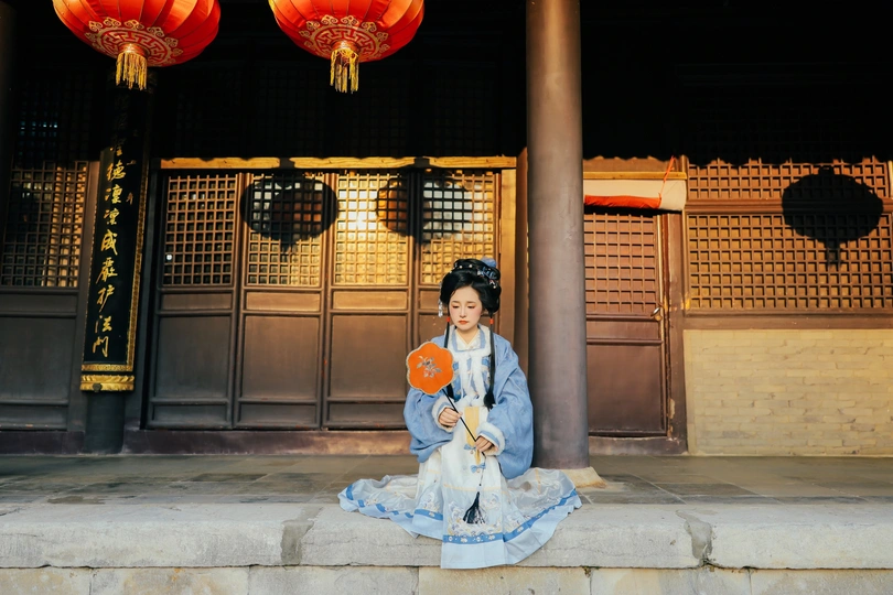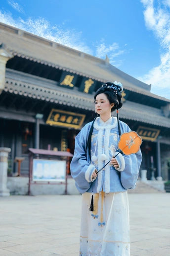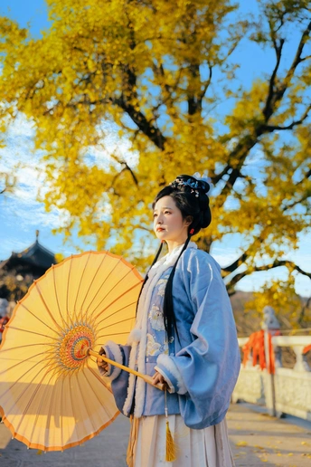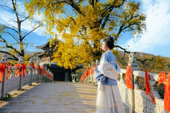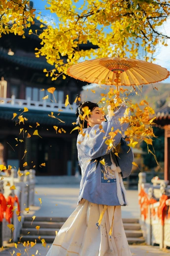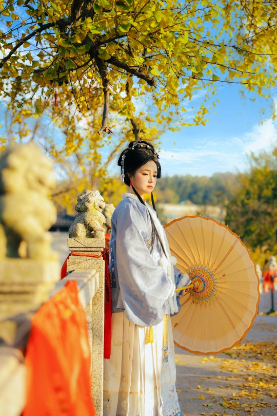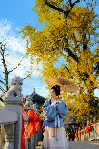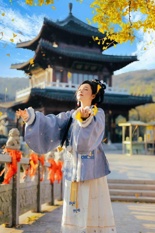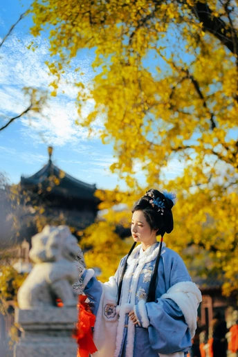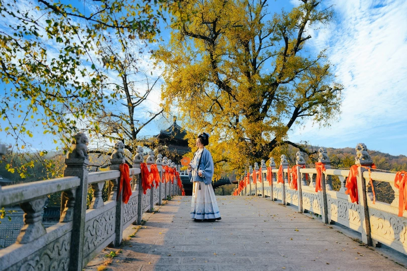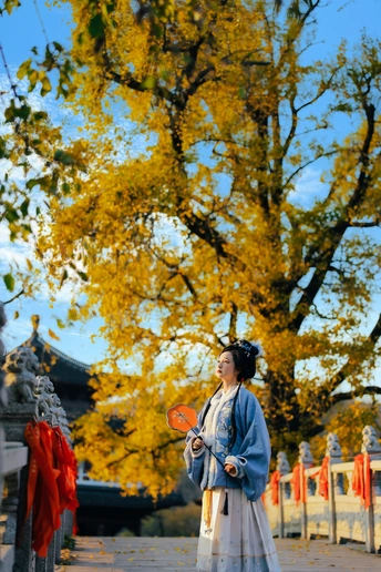 【秋染千华|明制汉服与六百年古寺的深秋邂逅】 宝华山麓,银杏翻飞成金帛 隆昌寺檐角风铃轻响 仿佛听见明朝的秋穿过时光裂缝 着一袭素雅明制 漫步千华古村青石板 赤色衣缘拂过满地鎏金 立领对襟勾勒出六百年前的风骨 古寺红墙为幕 银杏作画 光影在纻丝纹样间流淌 镜头捕捉的不止影像 是深秋寺廓里的一场千年旧梦 此刻 人与秋色俱醉 出镜:葵葵子 妆造:咔咔 摄影:许摄 器材:佳能R62+RF28-70 f2