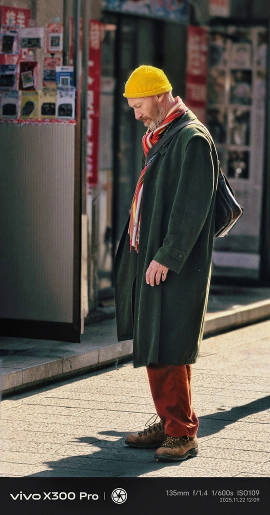 老巷子里邂逅的法国老先生,身着墨绿大衣配亮黄针织帽,围巾和红裤的撞色像把巴黎街头的松弛时尚,带进了老城区的烟火里。他说自己带着一个纪录片团队来拍这儿的生活,笑起来胡茬都暖。他告诉过我他的名字,可我没能记住。但这抹秋日里的随性穿搭,却成了老街最生动鲜亮的一帧。 vivo X300 Pro