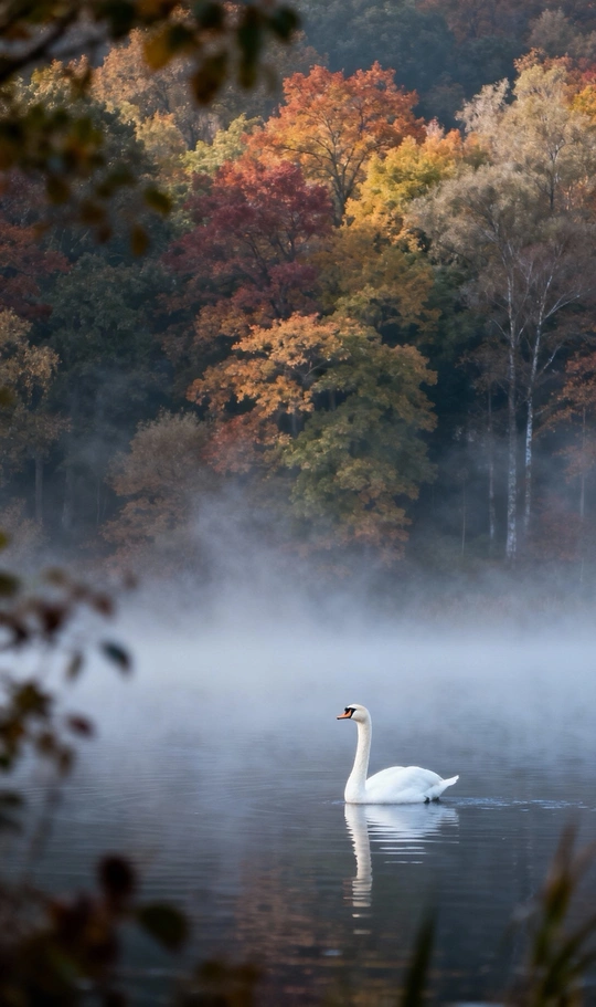 这张照片捕捉到了一个如诗如画的场景,白色的天鹅在雾气缭绕的湖面上优雅地滑行,背景是色彩斑斓的秋叶,整体氛围宁静而富有层次感。: 色彩:秋叶的色彩非常丰富,从深绿到金黄、橙红,构成了一幅美丽的秋色画卷。色彩的搭配和谐统一,营造了温暖、舒适的氛围。不过,略微调整饱和度,可能会让秋叶的色彩更加鲜明。 光影:光线柔和,营造出朦胧的雾气效果,增强了画面的意境。光线主要来自前方,照亮了天鹅的身体,使其成为视觉焦点。如果能捕捉到一丝侧逆光,或许能更好地勾勒出天鹅的轮廓。 构图:构图整体比较平衡,利用前景的树叶和背景的树林形成框架,突出了中间的天鹅和湖面。不过,前景的树叶略显杂乱,可以尝试调整拍摄角度,让前景更加简洁。 后期处理:后期处理整体自然,没有明显的过度修饰。可以适当调整对比度,使画面层次更加丰富,让天鹅更加突出。 主题原创性:照片的主题是宁静的秋日湖景,天鹅的出现增添了画面的生机和灵动。虽然主题并不算特别新颖,但拍摄角度和构图有一定的特色。 情感共鸣:照片成功地传达了宁静、祥和的情感,能够引起观者的共鸣。雾气和秋色的结合,营造了一种远离尘嚣的氛围,让人感到放松和舒适。