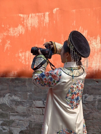 故宫里有很多穿满族服饰的人,男女老少都有。这不一位娘娘正在给