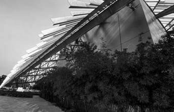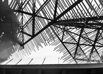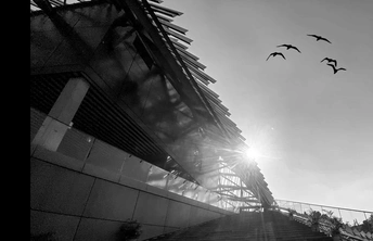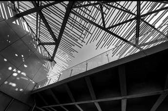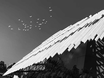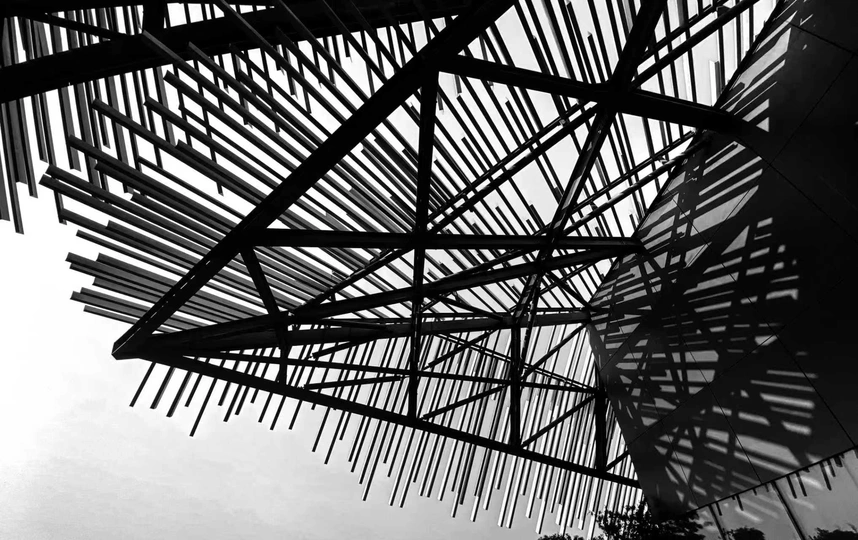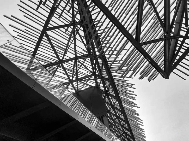 线条把天空切得细碎,光漏下来,鸟驮着影子掠过。