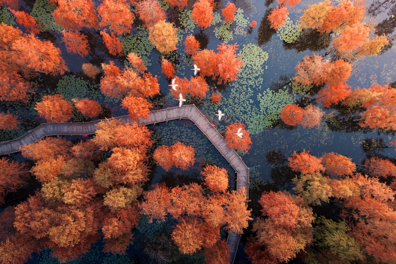 拍摄于南京池杉湖湿地公园,深秋时节的落羽杉依然全部转红。日出时分的天微微亮,我升起无人机,正好一群鸟从水杉上掠过,按下快门正好记录下了这一画面,可惜快门速度慢了一些,飞鸟有些动态模糊 池杉湖湿地公园地跨江苏省南京市六合区与安徽省滁州市来安县,总面积5800亩,由森林沼泽、河流湿地及库塘等构成,拥有华东地区最大的池杉林 Shot on Dji air3s