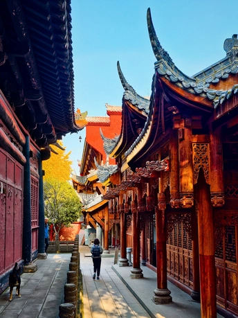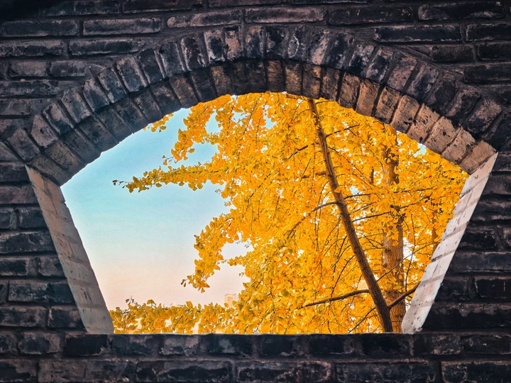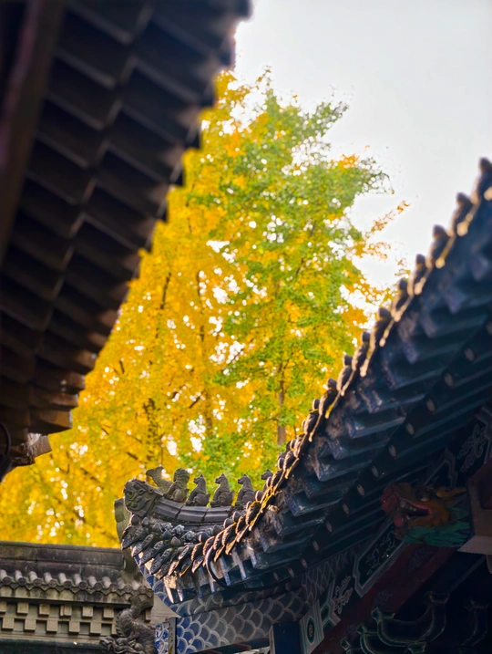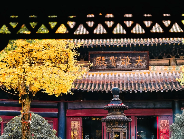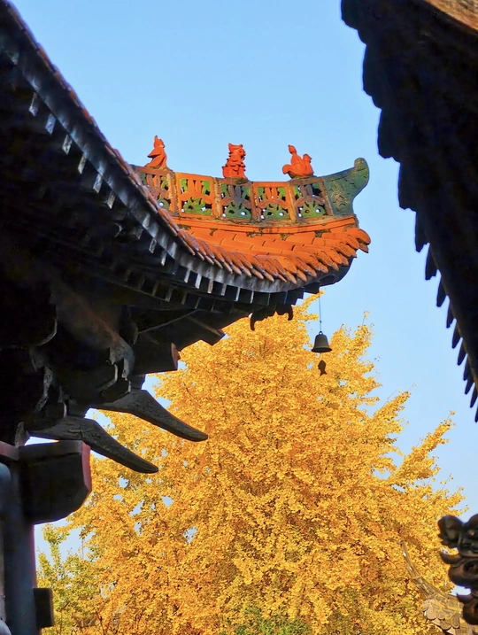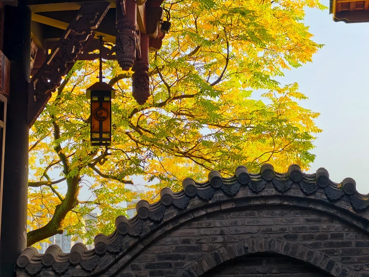 初冬的磁器口,宝轮寺的银杏正黄。 金黄叶片映着古寺飞檐,暖阳穿过枝丫洒在石阶, 光影落在墙面,慢慢走慢慢拍,把这份初冬的暖意收藏。