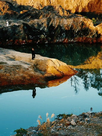 这幅作品在专业摄影维度颇具亮点。光影上,侧逆光精准塑造岩石质感,暖金光线勾勒轮廓、强化明暗对比,让岩石层次尽显,水面反光与人物剪影的光影互动,增添节奏。构图上,前景碎石芦苇与背景岩石人物形成多层空间,水面倒影造就对称构图,人物与岩石达成视觉平衡,点线面结合使元素有序且有张力。色彩上,暖岩与冷湖的互补色对比,既制造视觉冲突又实现平衡,增强冲击力。主题上,通过人物在矿坑的渺小感,传递孤独探索情绪,色彩冷暖对比也暗合情绪复杂。细节处两处人物形成叙事锚点,赋予画面故事留白。质感上,岩石粗糙、水面细腻、芦苇柔软的质感并置,丰富触觉感知,整体氛围超现实且富诗意,将矿坑工业感转化为艺术化视觉表达,是光影、构图、色彩与情绪表达结合的佳作。