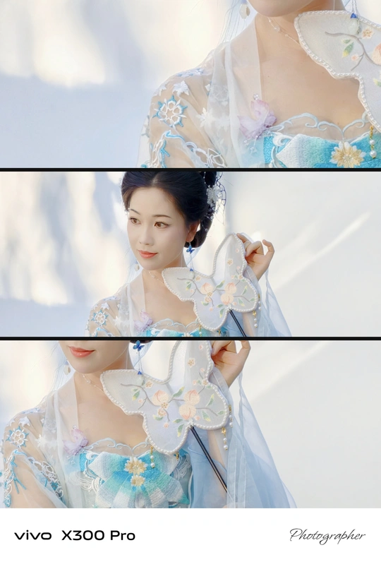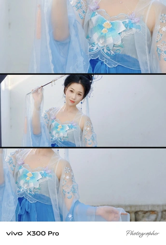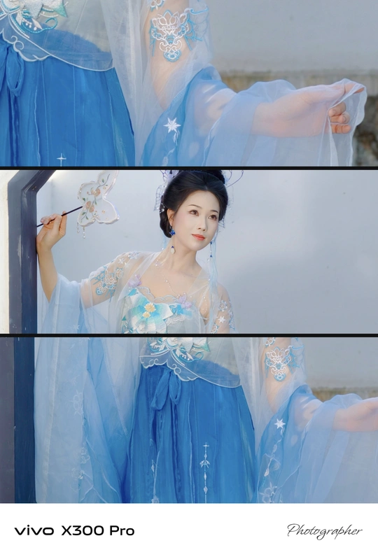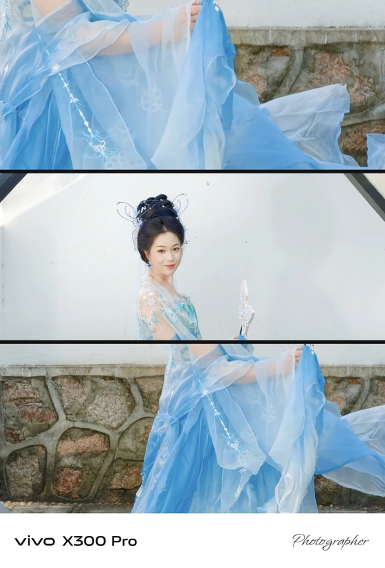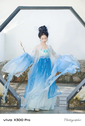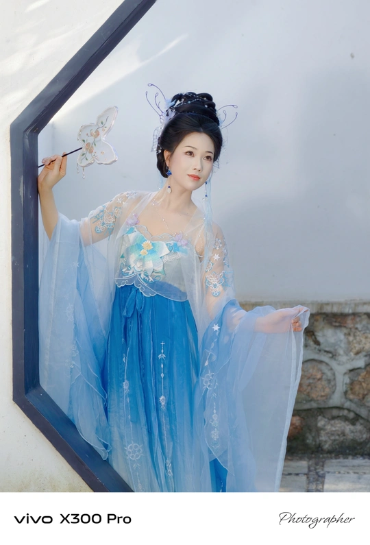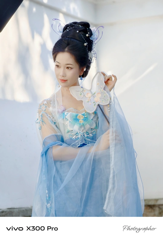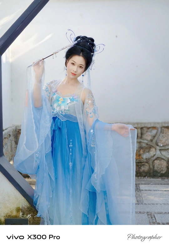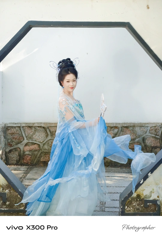 清透的薄纱像把月光揉碎在裙角,刺绣是星星点点的碎钻,走动时裙摆晃得像一汪流动的湖水~ 发饰选了带点灵动感的蝴蝶流苏,配一把玉簪小扇,往白墙石径旁一站,直接把国风氛围感拉满!