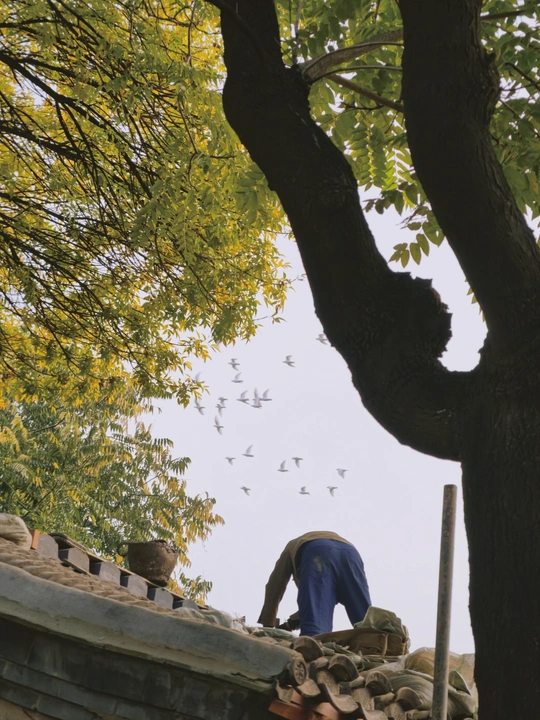 北京胡同,屋檐上的人修补着生活的边边角角,飞鸟却在天空写就自由的诗行,万物各有各的奔赴。