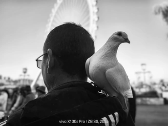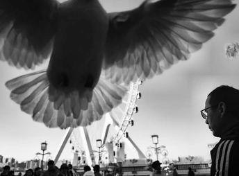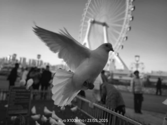 这张黑白照片抓拍了一只飞翔的鸽子,颇具动感。下面是一些建议,希望能帮助你更上一层楼: 色彩:黑白影调干净利落,但灰阶过渡略显生硬,可以尝试调整对比度和亮度,使黑白层次更丰富。 光影:光线较为平淡,缺乏戏剧性。尝试在日出或日落时分拍摄,捕捉更具氛围的光影效果。 构图:鸽子在画面中占据主导地位,但背景的摩天轮略显模糊,主体不够突出。尝试使用更大的光圈,或者调整拍摄角度,使背景更简洁。 后期处理:后期处理可以增强照片的表现力,但要避免过度修饰。建议在调整对比度和亮度时,注意保持照片的自然感。 主题原创性:拍摄飞翔的鸽子并不罕见,但你可以尝试加入自己的创意,例如结合特定的环境或情境,赋予照片更深刻的含义。 情感共鸣:照片传递了一种自由、活泼的情感,但还不够强烈。可以通过捕捉鸽子的神态或动作,增强照片的情感表达。 思想深度:照片的内涵较为简单,缺乏深层次的思考。尝试从更宏观的角度,例如人与自然的关系,去挖掘照片的意义。