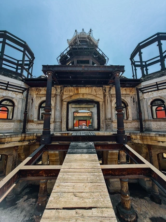残垣断壁间,藏着一座未完成的梦。 钢筋铁骨撑起飞檐斗拱,木桥通向时光深处。 这里不是废墟,是历史与现代的对话。