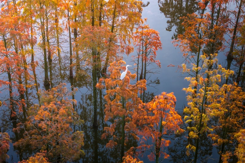 日出时分的池杉湖水杉林,一只白鹭停留在水杉枝头休息,我发现了它,它也发现了我。秋日的水杉逐渐转红,日出的侧光将树枝渲染上了一层光辉 池杉湖湿地公园地跨江苏省南京市六合区与安徽省滁州市来安县,总面积5800亩,由森林沼泽、河流湿地及库塘等构成,拥有华东地区最大的池杉林 Shot on Dji air3s