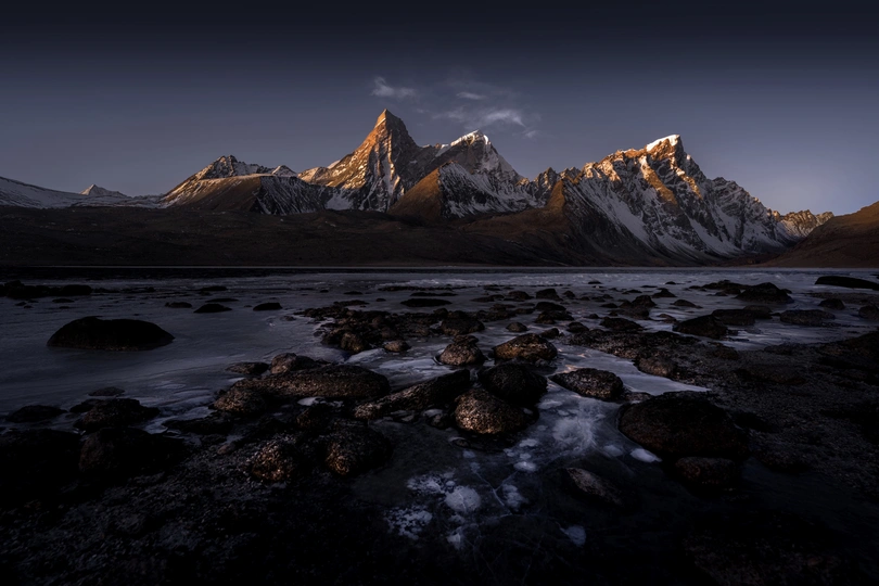 寒水啮石留残雪,晴光吻峰染赤金