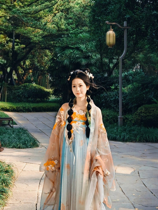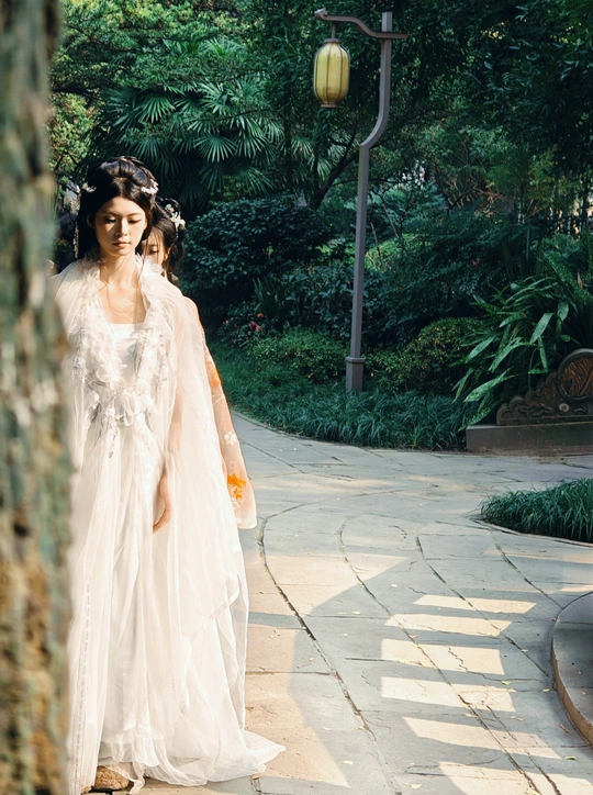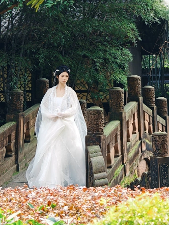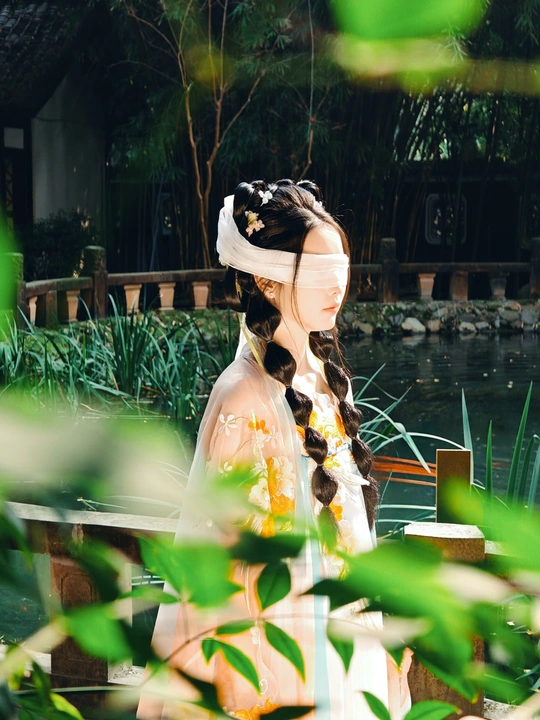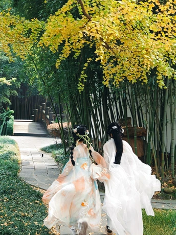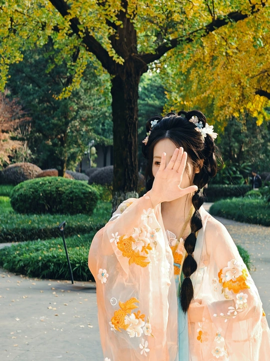 风掠过园林的刹那 金黄便脱离枝桠的锚点 以失重的韵律 铺展成流动的诗行 古装少女的身影 是时光遗落的帧 衣袂翻飞间 撞碎了枝叶筛下的光斑 那些跳跃的亮 便在地面洇开暖的晕 竹影摇晃着 搅动空气里的静 她低眉的弧度 轻叩千年的门 流水不语 却将柔情 刻进每一粒悬浮的尘埃 在这里 时间失去刻度 古典与自然的经纬交织 织成一张透明的网 网住所有未说出口的遐想