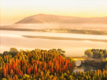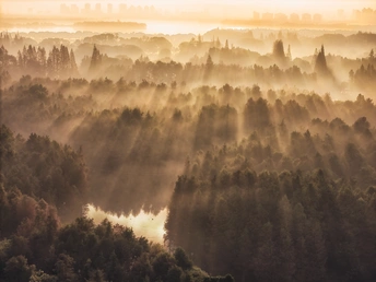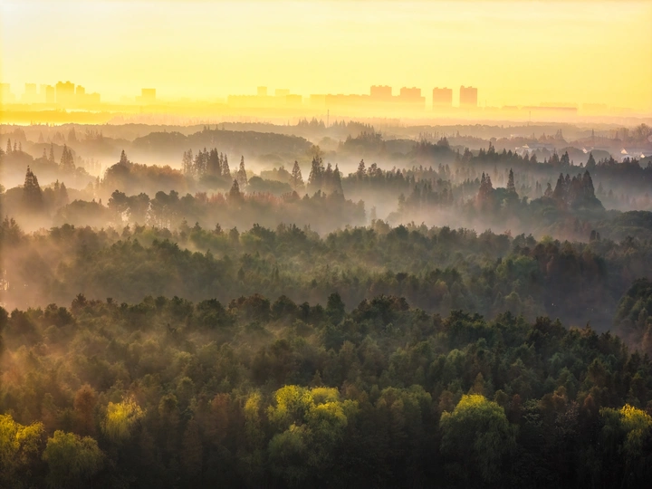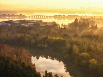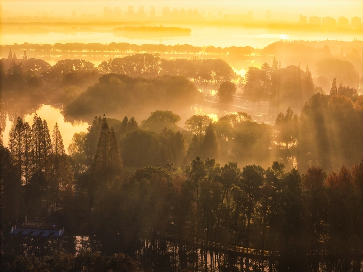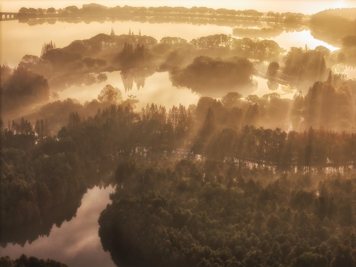 晨光照过这里 水汽弥漫成了雾 笼盖在这一篇水杉森林上空 它们穿过树梢空隙 像是一条有型的丝带 把远处的城市和此处的山水牵连在一起 城与森 这就是苏式江南水乡最美的一点
