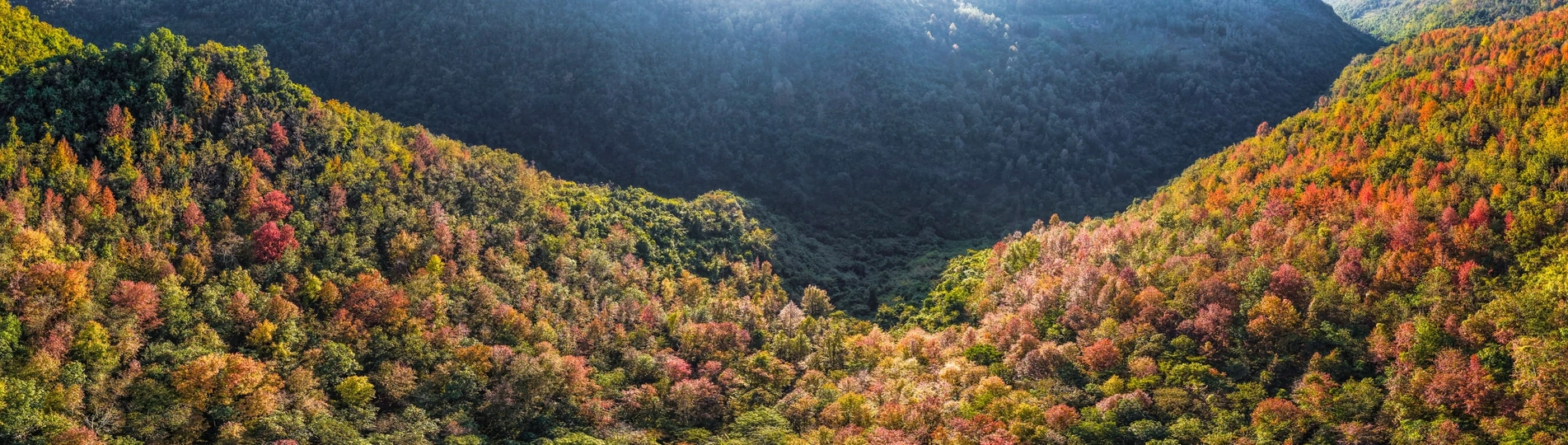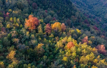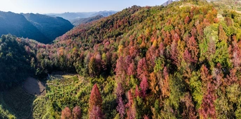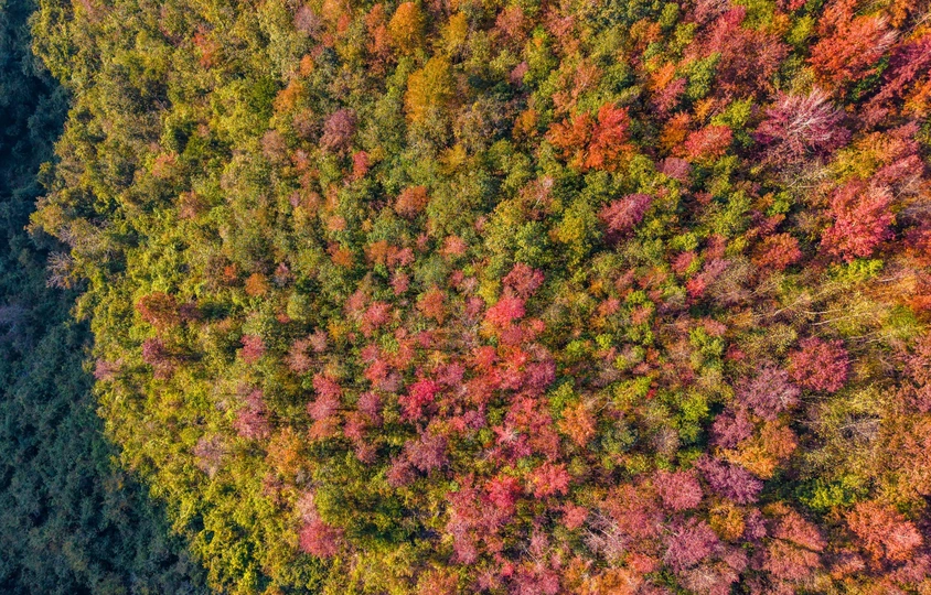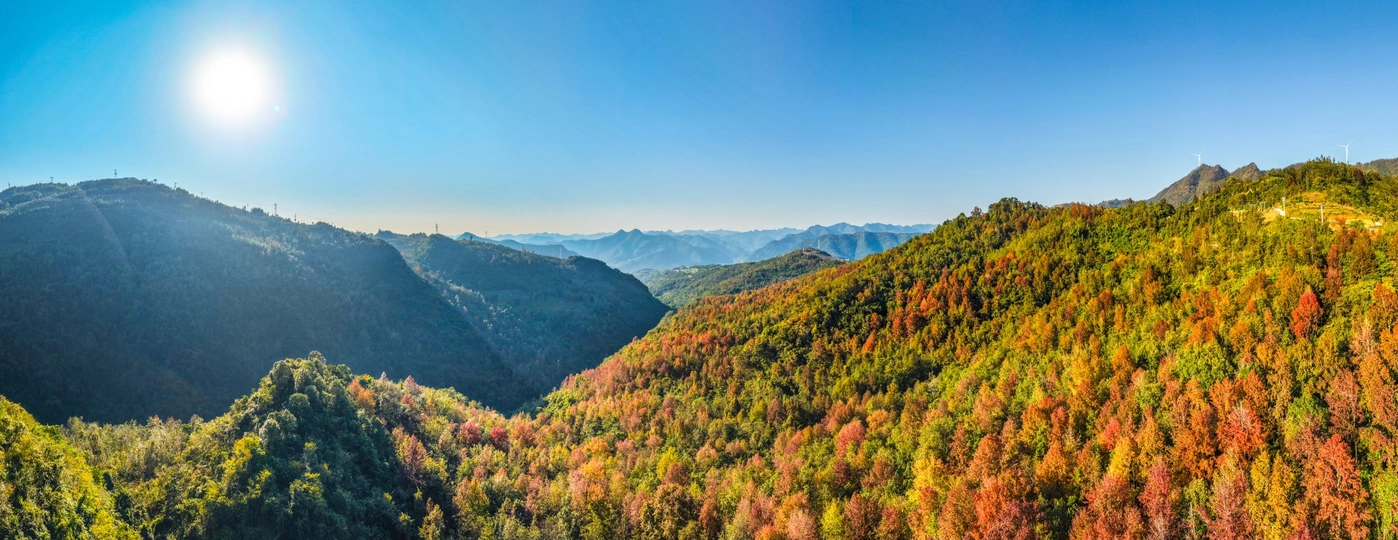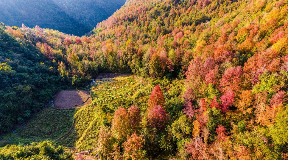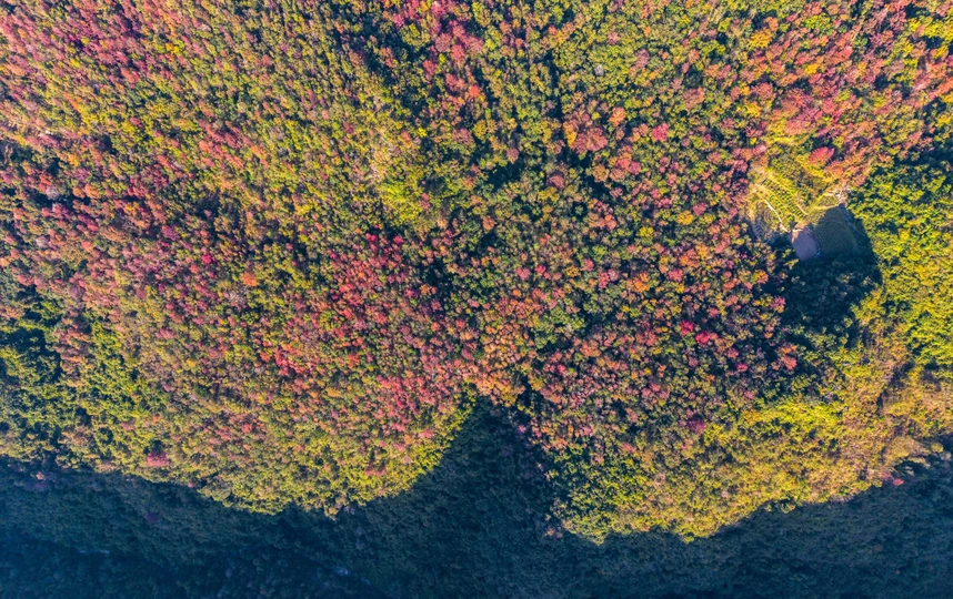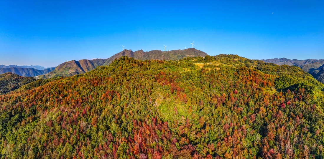 2025年11月30日,贵州省黔西南布依族苗族自治州望谟县新屯街道弄林村,寒冬时节,隐秘山谷中,连片野生枫香树林正上演着冬日限定的色彩盛宴。在蓝天暖阳的映衬下,赤橙黄绿青蓝紫交织错落,似大自然打翻了调色盘,将山谷渲染成诗意画卷。 作为少有的大面积原生枫香林,这里的树木历经岁月沉淀,枝干遒劲挺拔,叶片在寒冬中次第变色。阳光穿透林间,光影斑驳洒落,和山顶的村寨、山脊上的风力发电机组共同构成一幅动静相宜的冬日图景。 不同于春日的生机、夏日的葱郁、秋日的绚烂,望谟野生枫香林以冬日独有的多彩层次,印证了“多彩贵州”四季皆美的美誉,为冬日黔西南增添了一抹灵动暖意,也成为自然生态与人文秘境交融的绝佳见证。