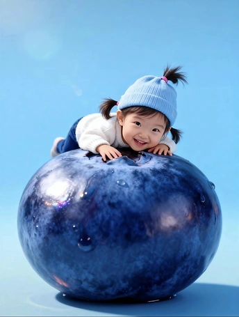 这是一场关于“小甜豆”的蓝莓童话:澄澈的天蓝色背景里,蓬松的针织帽坠着俏皮发尾,软乎乎的小身子趴在巨型蓝莓上,指尖轻搭着浆果饱满的弧度——水珠凝在深紫的果皮上,像揉碎的星子,连空气都浸着清甜的软香。她笑起来时,整个世界都跟着裹进了这颗酸甜的梦境里。