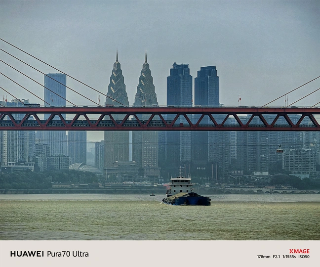 雾霭轻笼的长江面上,货船破开细碎的波纹,将粼粼水光揉进灰蓝的天色里。红色的东水门大桥斜索如弦,横亘在江与城之间,桥身的钢铁骨架裹着几分湿润的潮气,把对岸的喜来登双子塔衬得愈发尖秀。那些摩天楼的玻璃幕墙浸在薄烟中,轮廓晕成浅淡的剪影,唯有双塔的鎏金尖顶,还沾着些未散的微光——这便是渝江桥影里的重庆,一半是江波的温软,一半是山城的棱线。