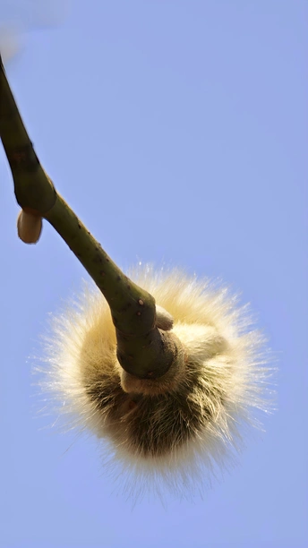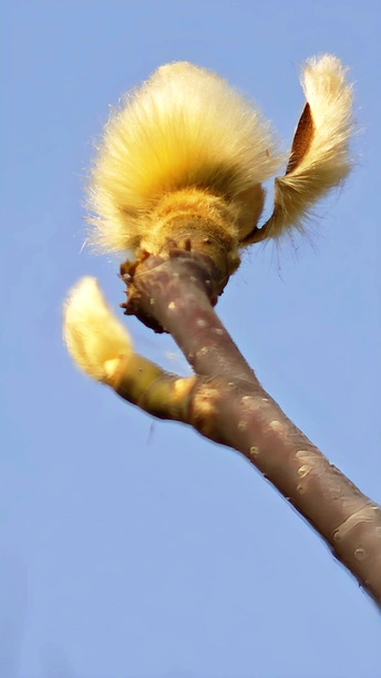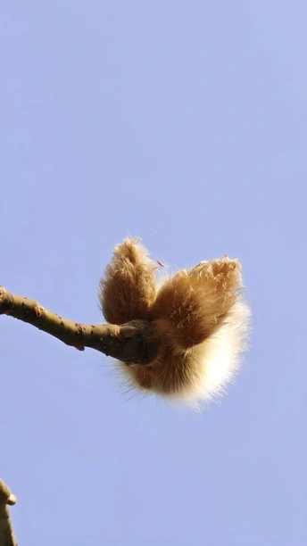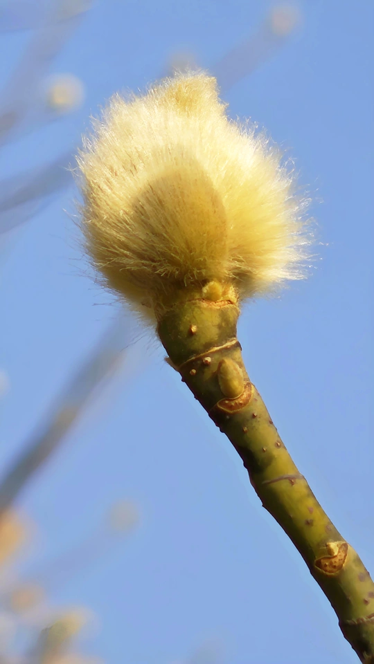 东风吹起木兰香,辛夷花白柳梢黄。花蕾“辛夷”也是武当木兰的花苞,呈卵形,外面包裹着密密的黄色绒毛,柔软且带有光泽,可保护幼嫩组织免受低温、虫害侵袭。是植物适应环境自然演化的结果,玉兰花苞的出现常被视为“春的气息”,象征着希望与新生!