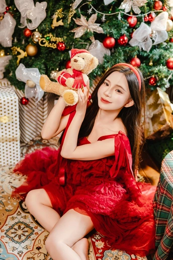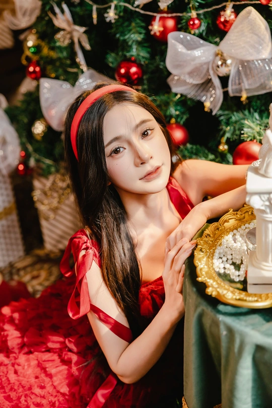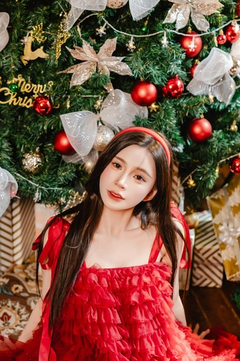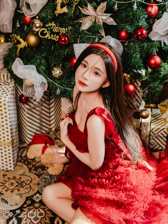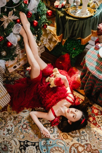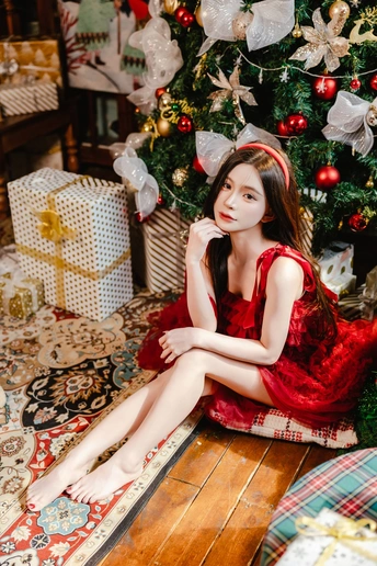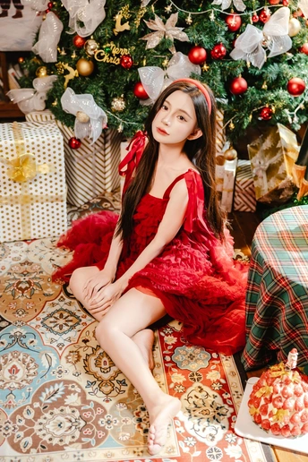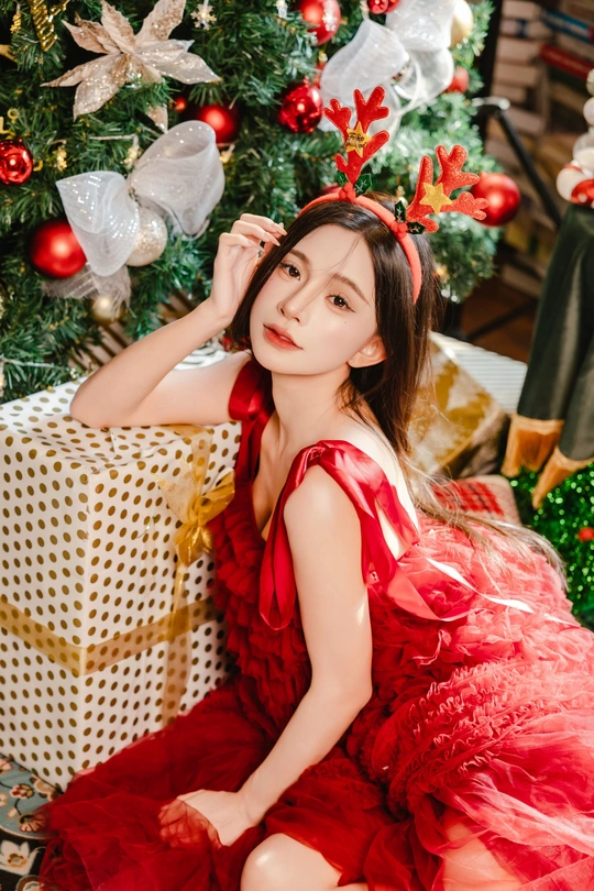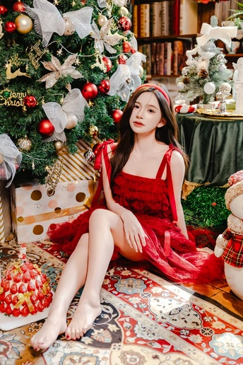 《赤枕圣诞》 出镜:gaga 地点:雨果相馆 红裙陷进毛绒毯,指尖掠过礼物盒银光。 她赤脚踩碎地毯图案,将暖意卷成蝴蝶结——系在驯鹿发箍与草莓蛋糕之间。
