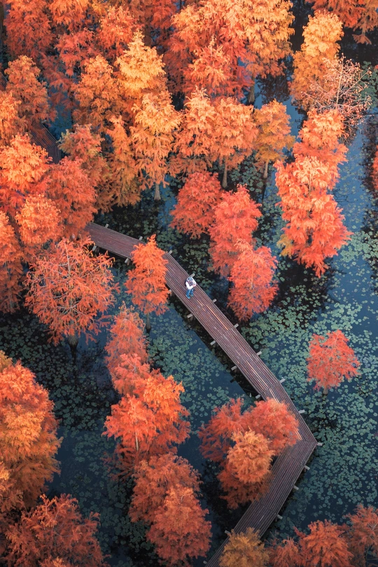 拍摄于南京池杉湖湿地公园,落羽杉已全部转红,林间的栈道上一位游客正在赏秋 池杉湖湿地公园地跨江苏省南京市六合区与安徽省滁州市来安县,总面积5800亩,由森林沼泽、河流湿地及库塘等构成,拥有华东地区最大的池杉林 Shot on Dji air3s