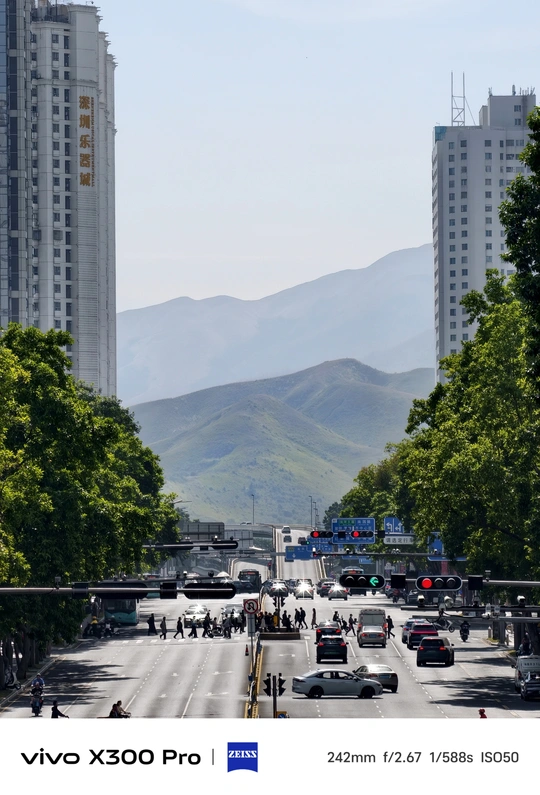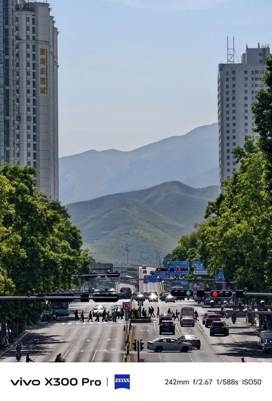 坏了,深圳也能看到阿勒泰了 偶然路过, 站在天桥上吹风。 眼前的路被车流烫成一条发光的河, 阳光抖落在行色匆匆的肩头。 远处的山笼着一层淡蓝的雾, 像被城市轻轻托着, 山就在那里, 安安静静,等着你发现。 Shot on vivo X300 Pro