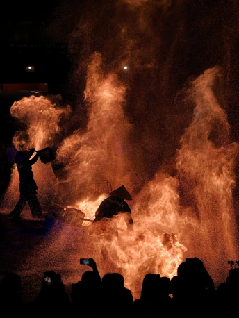 夜色里的焰浪翻涌如赤龙狂舞,斗笠下的身影却在火海中踏成侠者的轮廓——一人扬臂掀动灼人的热浪,一人俯身似要撷取焰心的光,衣袂与火舌擦过的瞬间,竟把危险烫成了独属于夜色的豪侠写意。围观的镜头追着焰尖,却追不上他们敢向火域行的飒沓,这一瞬,烟火人间里便多了段焰中侠客的滚烫传说。