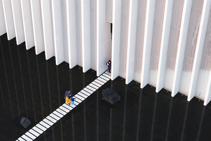水池中延伸出的白色石阶像极了一个个钢琴上的琴键。一位母亲带着小孩在石阶上蹦蹦跳跳,父亲则在身后用手机记录这一画面,给冰冷的建筑增添了一分温情。拍摄于安徽宣纸博物馆,极简的建筑非常有特色,线条分明的白色建筑与水面倒影交相呼应。 Shot on Dji air3s