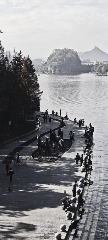 黑白镜头里的漓江岸,成了垂钓者的“悠然小天地”:滨水步道的临水一侧,三三两两的钓者或坐或立,长竿垂向泛着细波的江面,身影被树影剪得疏疏斜斜。远处象鼻山隐在薄雾里,衬得近处的钓线、渔具更显松弛——这是桂林人把日常闲趣,直接安在了山水画卷的边边角角里。