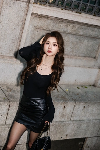 暗调诗行 出镜:飘飘 地点:广州沙面 黑裙掠过砖墙与铁栏,高跟鞋尖点过枯叶石阶。 她托腮倚坐的剪影,将夜色叠成一句冷艳的都市诗。