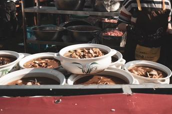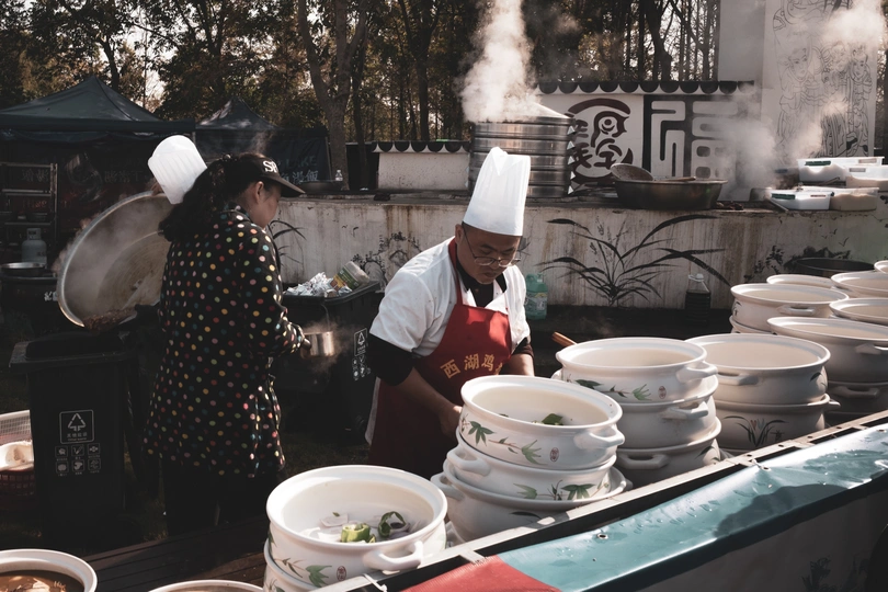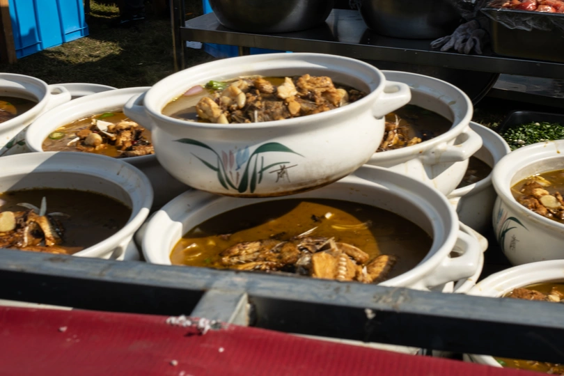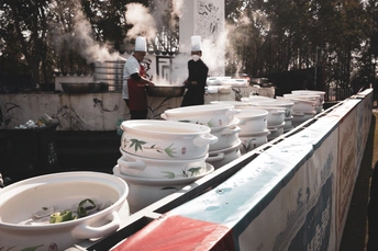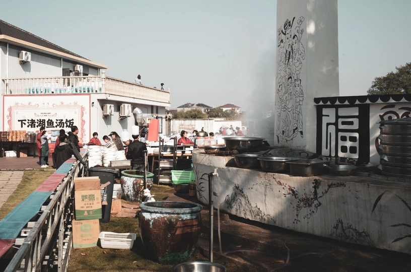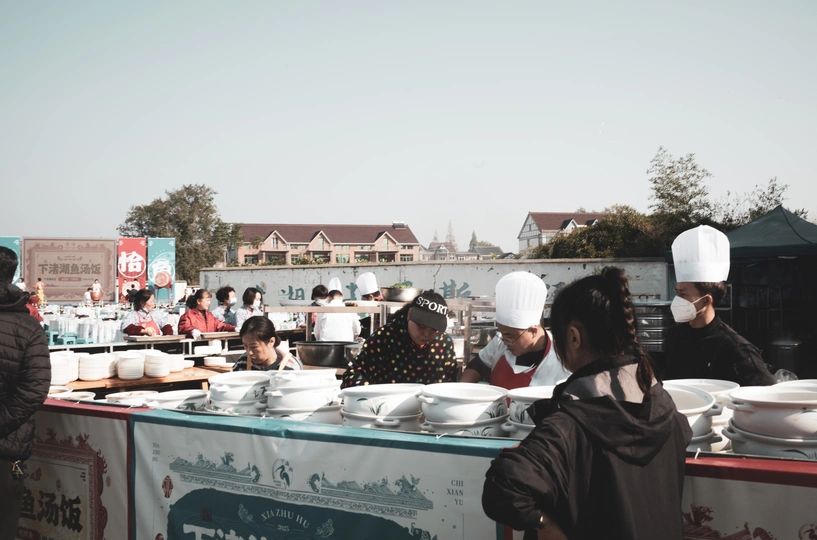 下渚湖鱼汤饭,下渚湖鱼汤饭是浙江德清下渚湖地区的传统民俗美食,也是当地丰收文化的代表。 下渚湖鱼汤饭习俗可追溯至吴越时期,当地村民以养鱼、捕鱼为生,吃鱼汤饭是渔民庆祝渔业丰收的习俗,表达了对丰收的喜悦和对来年美好生活的期盼。如今,鱼汤饭已成为下渚湖防风渔祭活动的重要组成部分。每年秋末冬初,在防风渔祭后,渔民们会进行聚网捕鱼,随后厨师们用传统技法烹制鱼汤饭,供游客品尝。 下渚湖鱼汤饭通常选用3到5斤重的新鲜鲢鱼,即包头鱼。以柴火灶为最佳,先将鱼放入锅中,加调料后用旺火烧半小时,再小火慢炖半小时,直至汤汁浓郁入味。 吃鱼汤饭有“一捞二浇三挑四拌五吃”的讲究,即先捞出鱼骨,再将鱼汤浇在米饭上,挑出鱼刺后,把饭与汤细细搅拌,让米饭充分吸收鱼的鲜味。