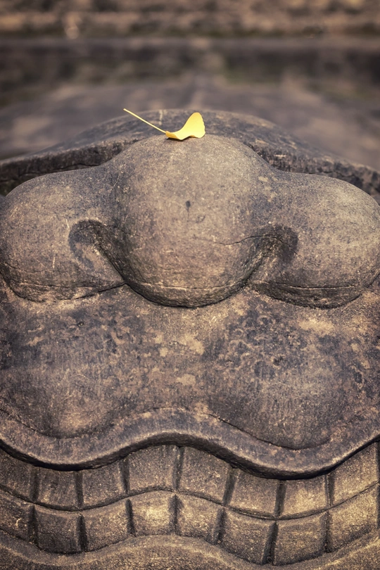 这幅作品以极致特写的构图,定格了"永恒与瞬间的相遇"。画面采用垂直构图,将石雕构件的云纹轮廓置于中心,风化的石面占据80%的画面空间,粗糙的肌理与凹陷的纹路构成自然的视觉引导线,最终汇聚于顶端那片银杏叶——它如金色的逗号,轻盈地悬在石雕最隆起的弧线上。背景刻意虚化,仅保留石面的横向纹理,形成"近实远虚"的层次,让观者视线无法回避这组强烈对比:下方是千百年岁月雕琢的坚硬石质,上方是仅有数日生命的脆弱叶片,这种"重与轻""刚与柔""永恒与短暂"的视觉博弈,构成作品最震撼的张力。 色彩上呈现"古铜色的时光叙事"。石雕主体以青灰为基调,表面因风化形成深浅不一的赭石色斑,沟壑处沉淀着暗褐色的岁月痕迹,阳光照射的凸起部分泛着古铜色的金属光泽,整体色调如陈年宣纸般沉静;而那片银杏叶的明黄则如跳跃的音符,在沉稳的古色调中撕开一道温暖的口子,其叶脉的纤细纹路与石面的粗犷肌理形成微观层面的材质对话。这种"单色背景+单点亮色"的极简配色,既符合传统文人"惜墨如金"的审美追求,又通过色彩的强烈反差凸显主题——在漫长的时光长河中,短暂的美好更显珍贵。 情感表达上传递"温柔的时空对话"。坚硬中的柔软令人心生敬畏。