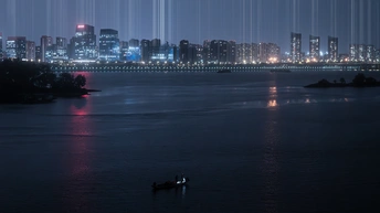 在洪塘大桥上吹着夜风,偶然间看到江上一点昏暗的灯光,勉强辨认出是一艘渔船,一抬头,又是那灯火通明的霓虹城市,一边看着渔民在黑暗江上凭借一盏灯辛勤劳作,一边想着对岸霓虹光辉中说不定也有人正为了理想而奋斗,这一切在黑夜中凭借光线相互辉映,也添上一层如梦似幻