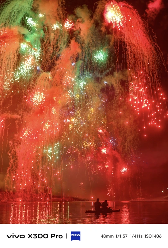 夜空中,绚烂的烟火如花朵般尽情绽放,红的热烈,绿的清新,色彩交织成梦幻的画卷。而在下方平静的水面上,一叶扁舟静静漂浮,舟上两人依偎,仿佛整个世界都只剩下彼此与这璀璨烟火。烟火的热闹与两人的静谧形成鲜明对比,浪漫氛围在这一刻无限蔓延。