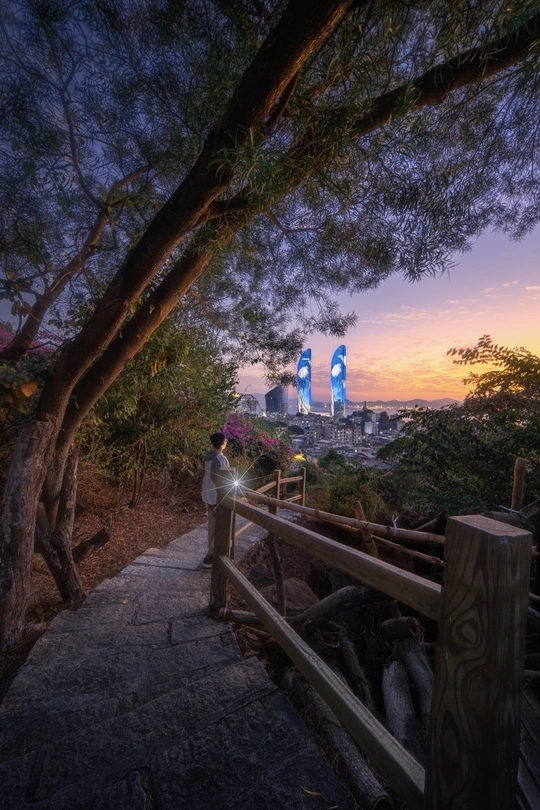 在厦门的山间步道,石阶裹着草木余温,我倚栏而立,看暮色漫过天际,世茂双子塔的蓝荧光,从错落的城郭间轻轻亮起,这是我与厦门暮色的温柔对望。