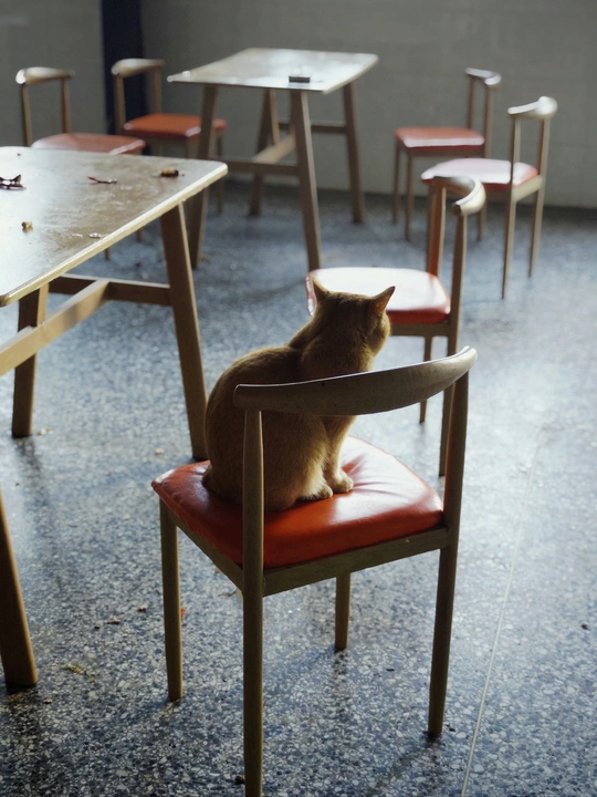 空荡荡的餐厅里,大橘静静地坐在椅子上。
